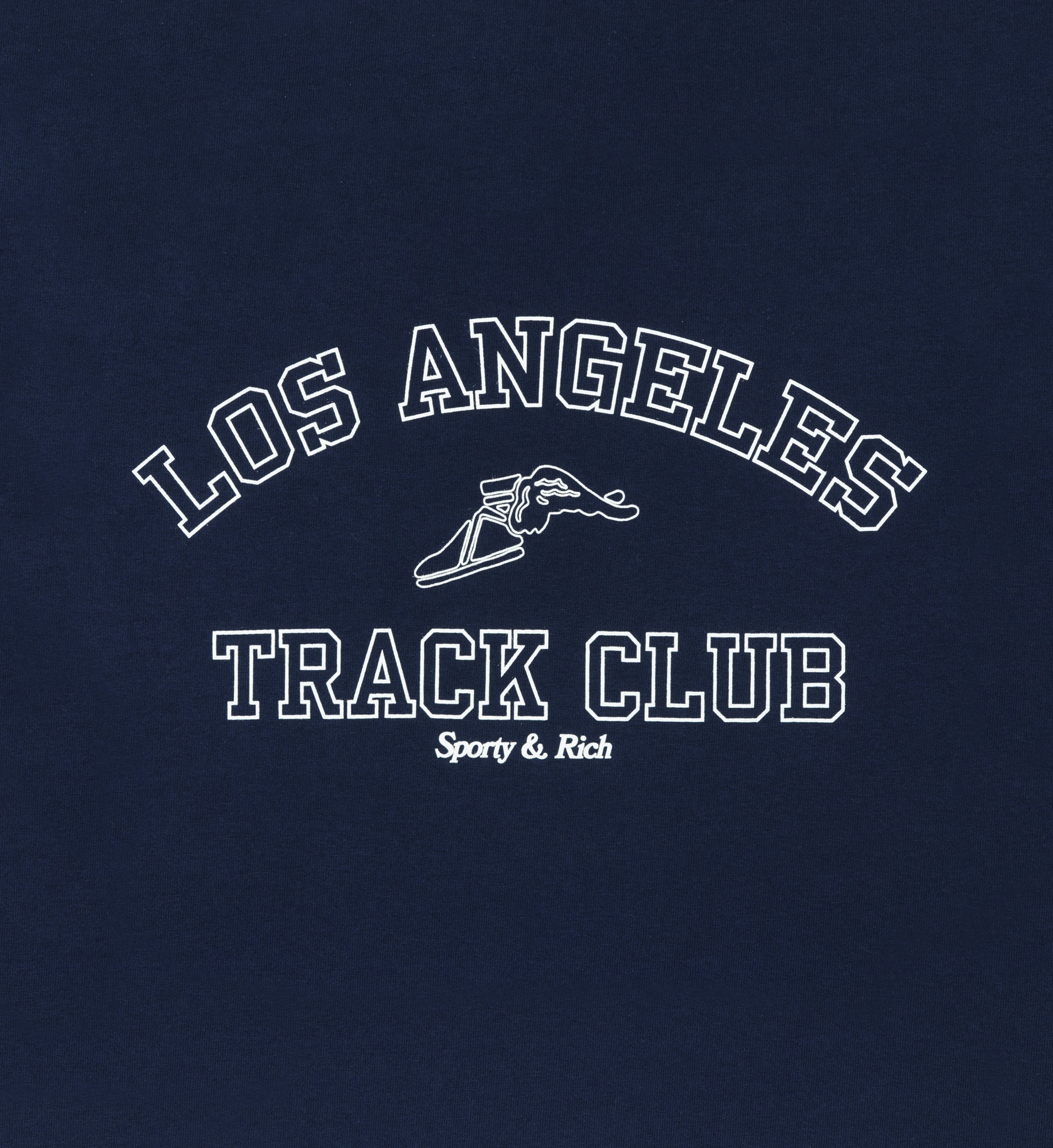 Our Track Club T Shirt in Navy/White. Constructed of 100% USA grown cotton, our tees are pre-shrunk and fit slightly oversized. Our T-shirts are made in Los Angeles where our factory pays its employees above minimum wage + overtime and benefits. Model wears a size S.