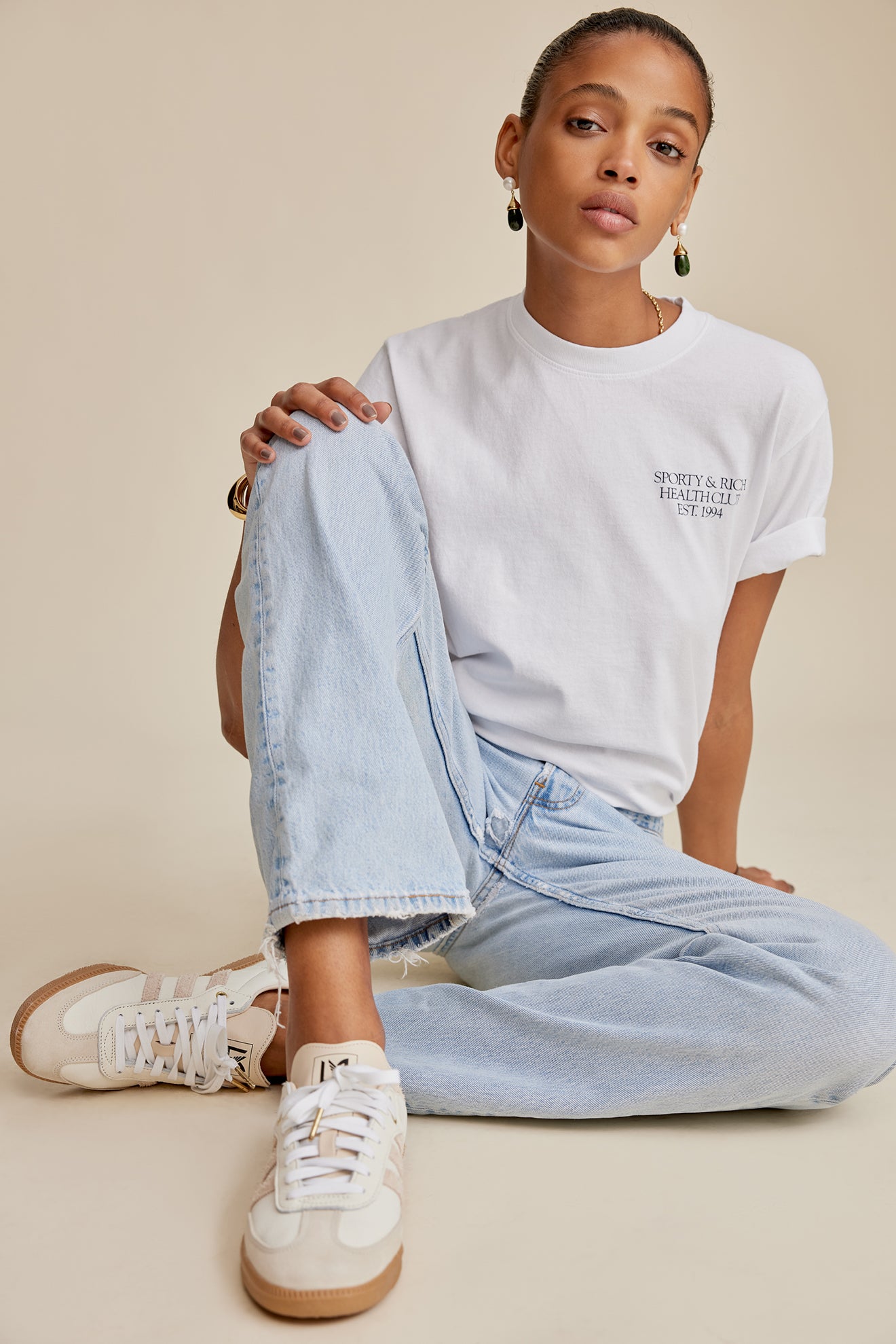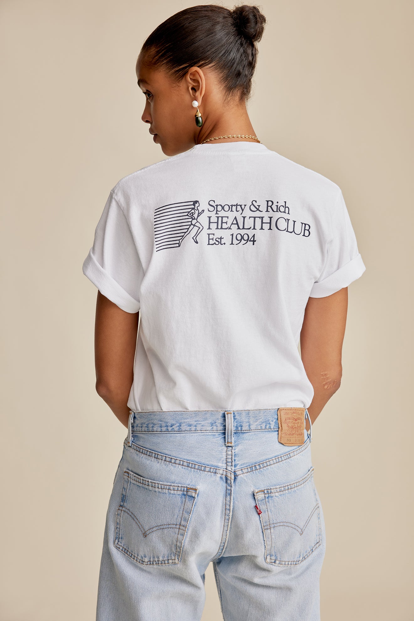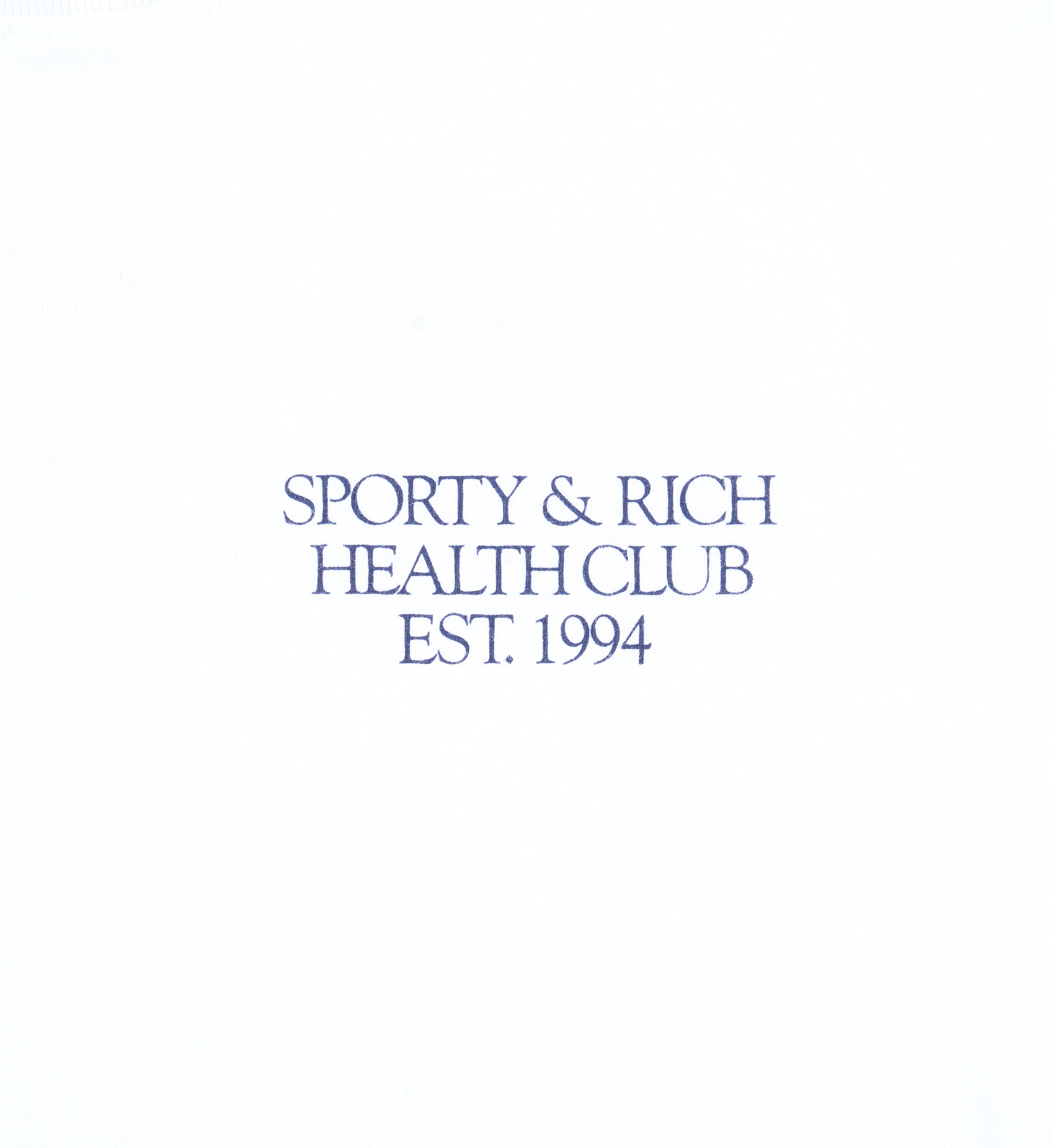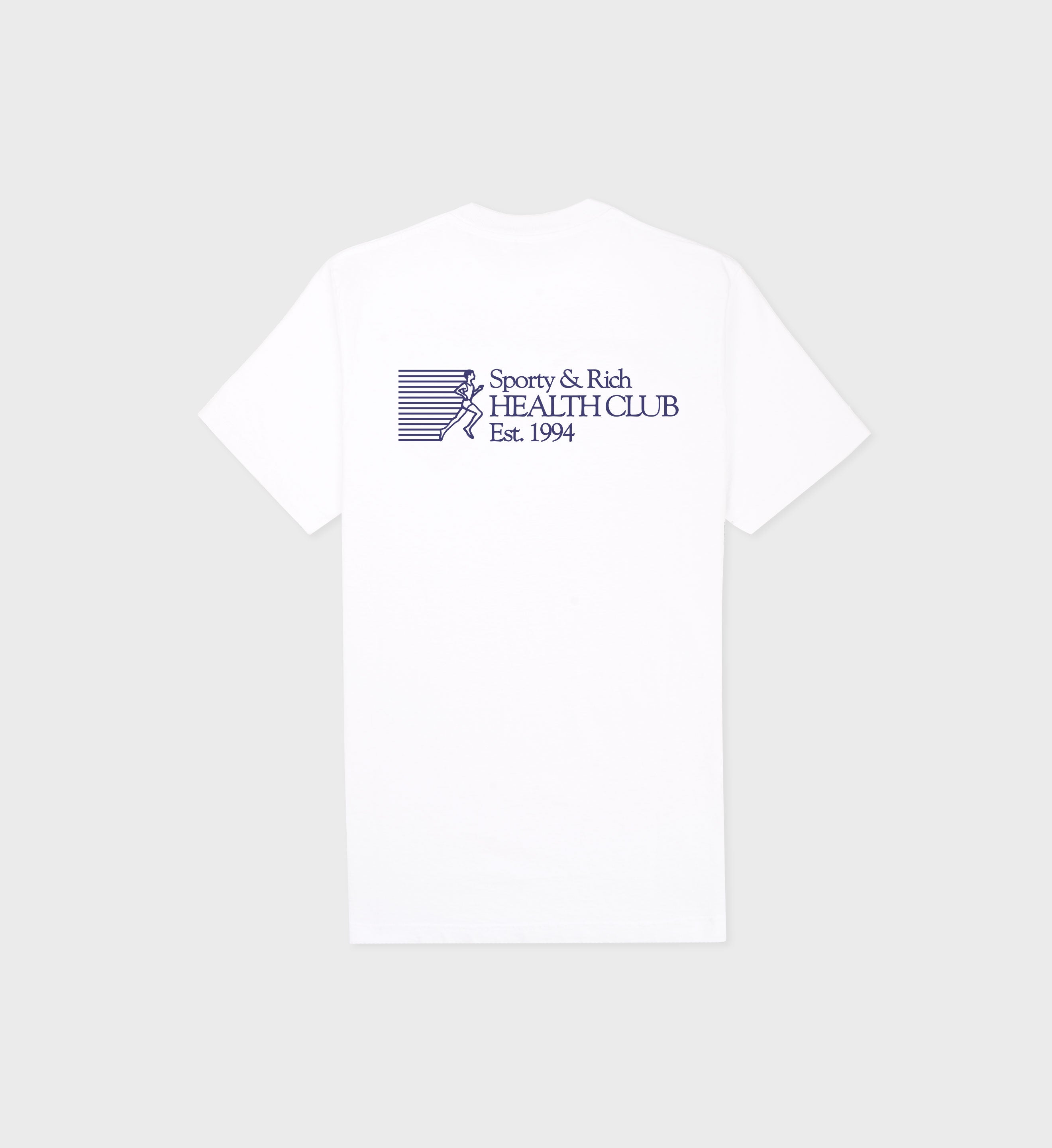 Our 94 Health Club T Shirt in White/Navy. Constructed of 100% USA grown cotton, our tees are pre-shrunk and fit slightly oversized. Our T Shirts are made in Los Angeles where our factory pays its employees above minimum wage + overtime and benefits. Aya is 5'10' and wears a size S.
