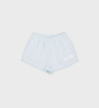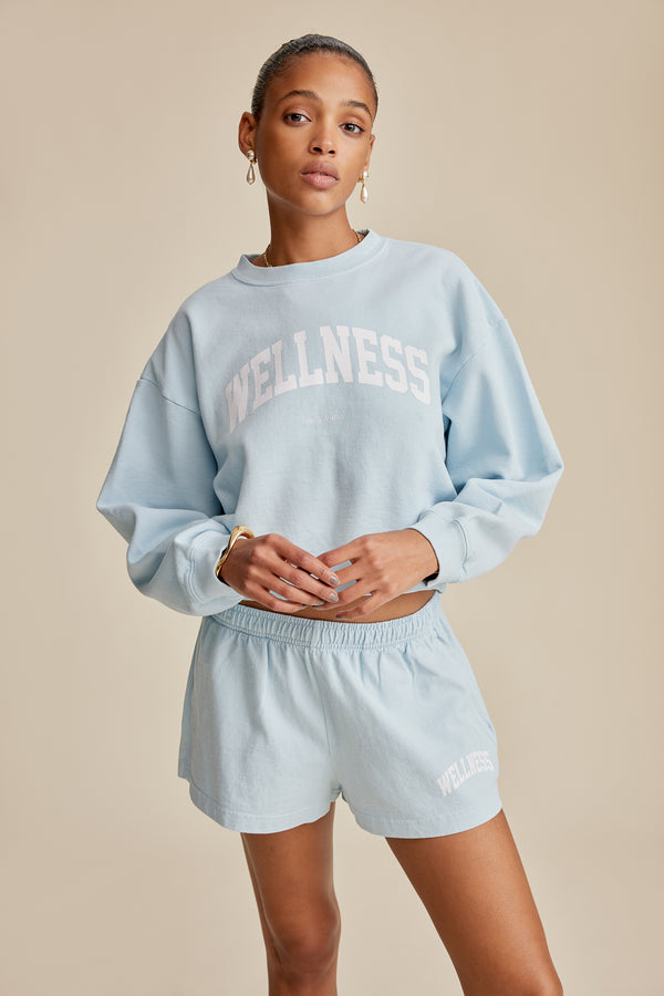 Our Health Resort Cropped Crewneck in Baby blue/White. Constructed of 100% USA grown cotton, our cropped crewnecks are pre-shrunk and fit slightly oversized with a cropped length. Our crewnecks are made in Los Angeles where our factory pays its employees above minimum wage + overtime and benefits. Marlee is 5'9'/174cm and wears a size S.