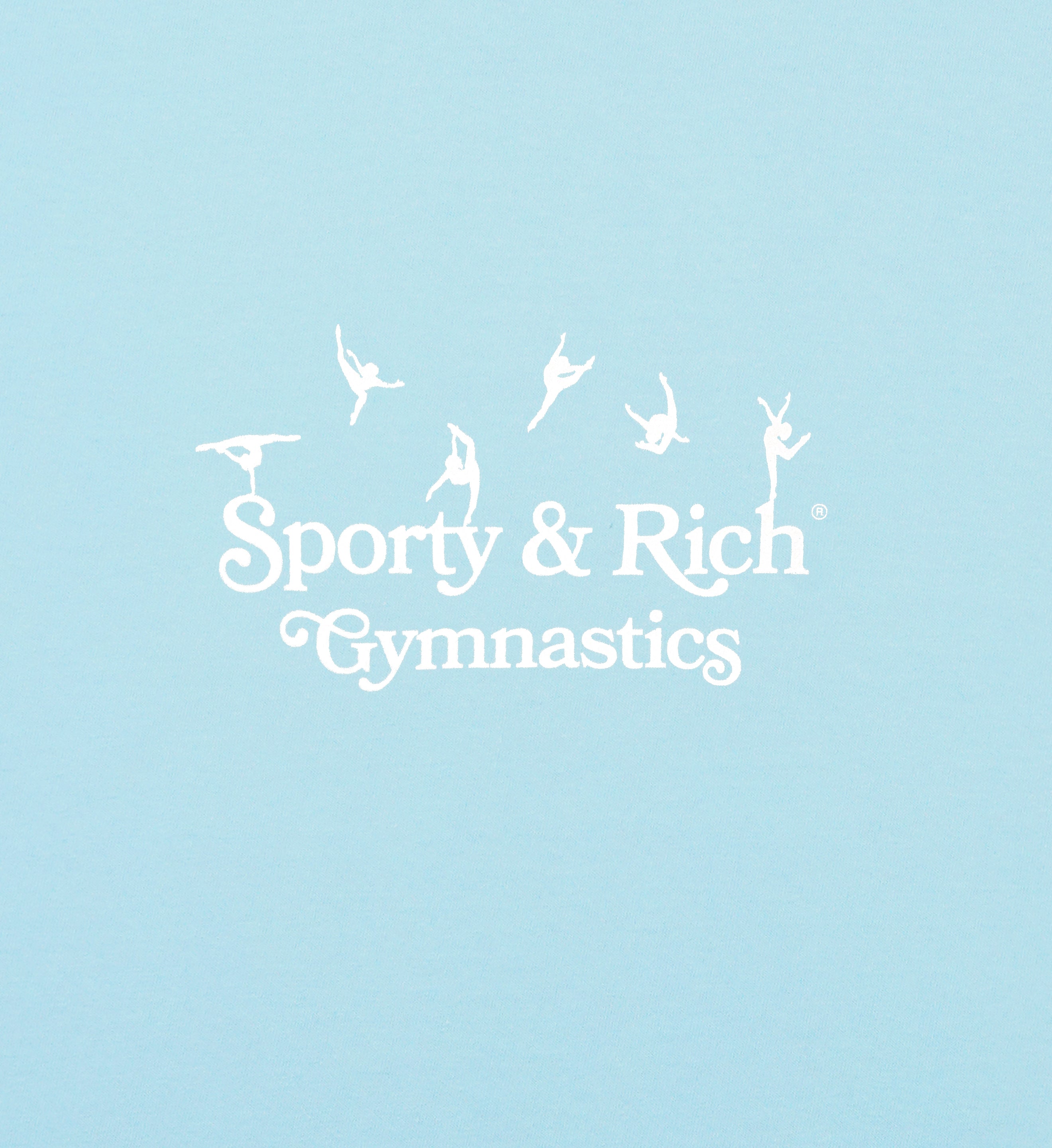 Our SR Gymnastics T-Shirt in Baby Blue. Constructed of 100% USA grown cotton, our tees are pre-shrunk and fit slightly oversized. Our T-shirts are made in Los Angeles where our factory pays its employees above minimum wage + overtime and benefits. Karly is 5'10' and wears a size S.