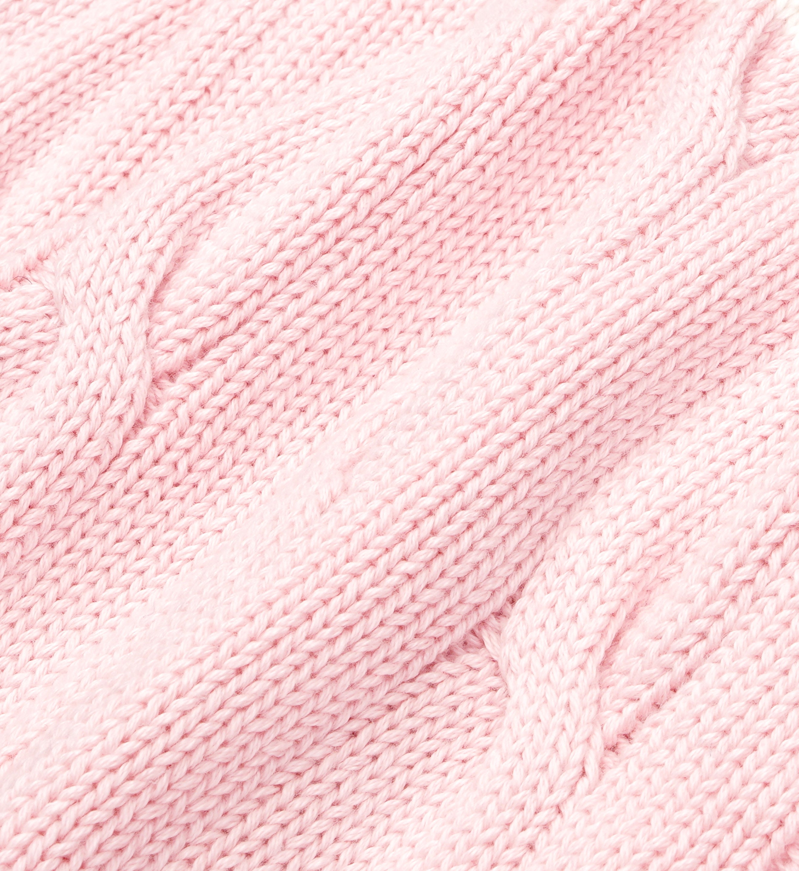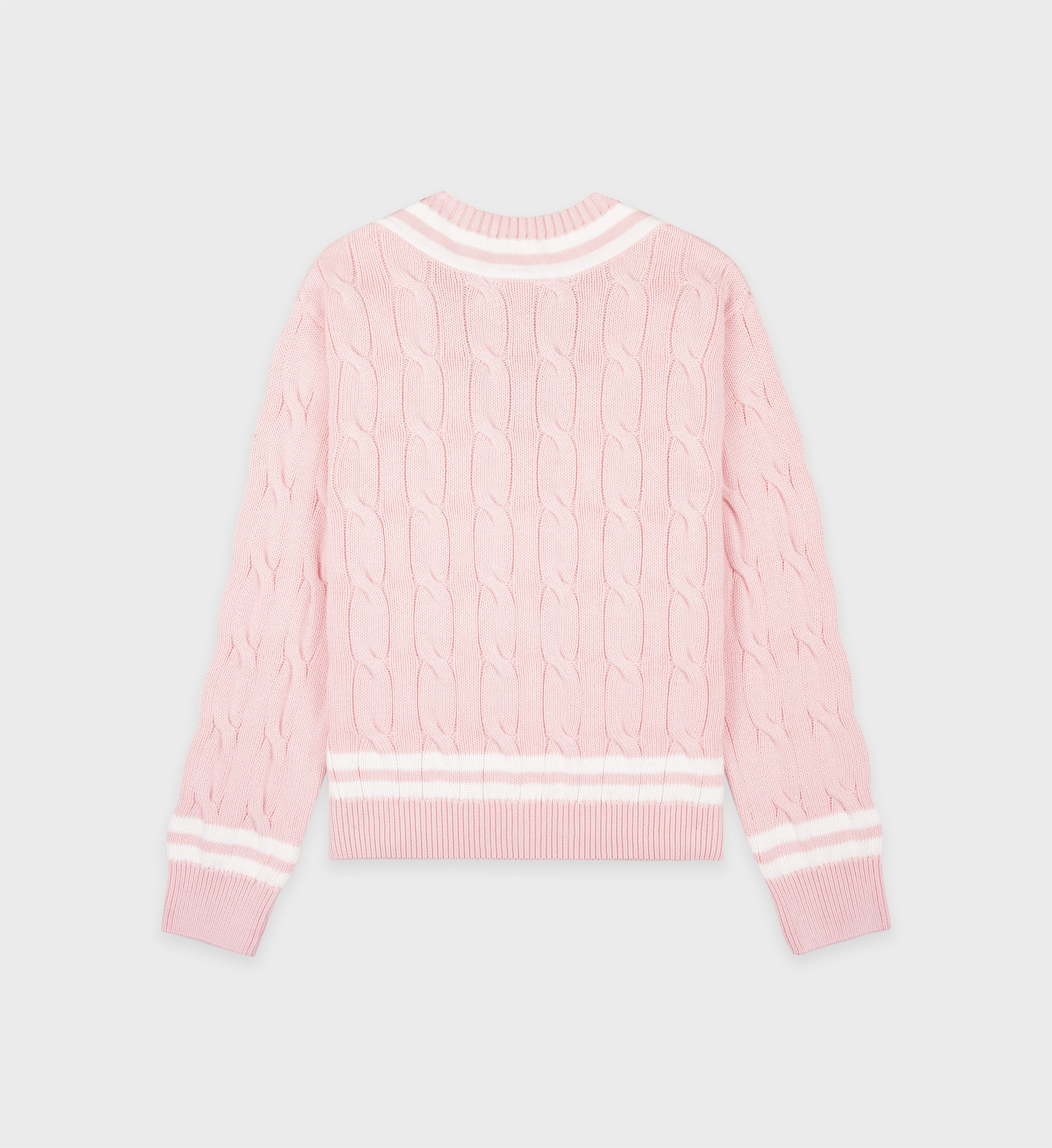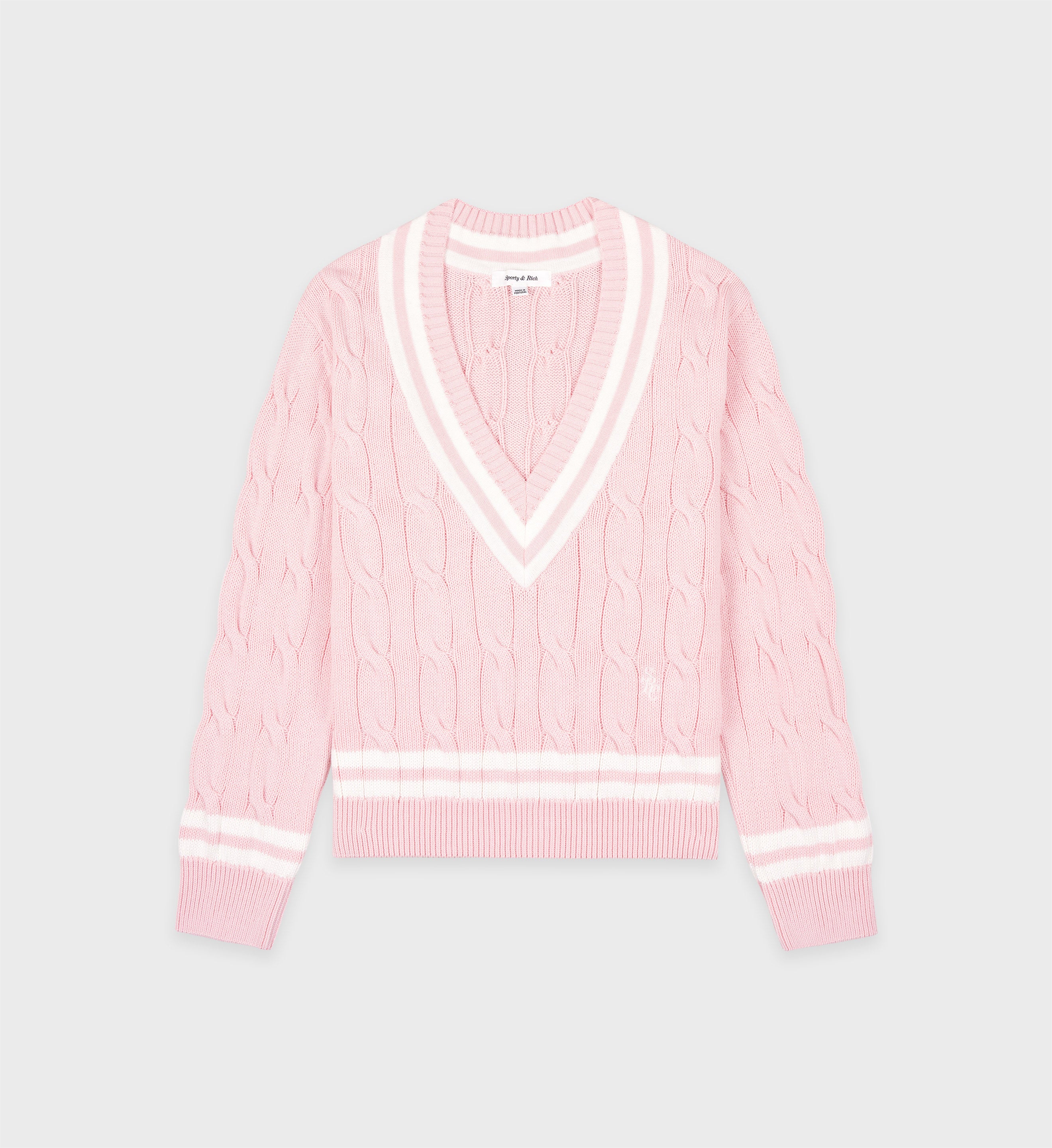 Our SRC Cableknit Sweater in Baby Pink/Cream. Constructed of 100% cotton. our cableknit sweaters are made in Portugal at one of the finest knitwear factories in Europe. Features a deep v-neck with contrasted stripes. Luna is 5'10'/178cm and wears a size S.